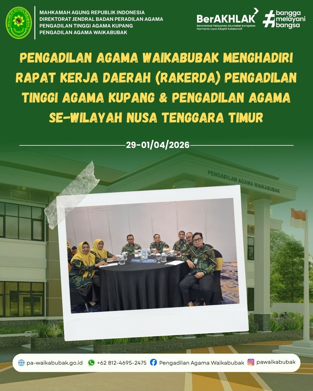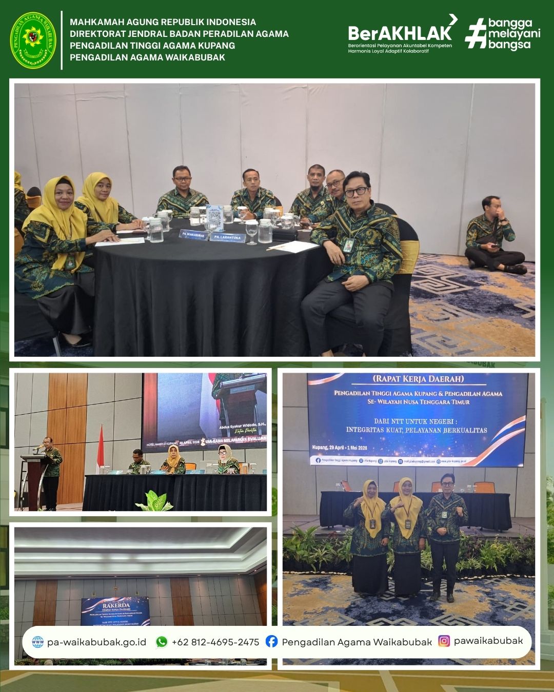 Kupang, 29 April 2026 – Jajaran pimpinan Pengadilan Agama (PA) Waikabubak yang terdiri dari Ketua, Panitera, dan Sekretaris, hadir secara langsung dalam pembukaan Rapat Kerja Daerah (RAKERDA) yang diselenggarakan oleh Pengadilan Tinggi Agama (PTA) Kupang. Acara tahunan yang mempertemukan seluruh satuan kerja Pengadilan Agama se-wilayah Nusa Tenggara Timur ini digelar mulai Rabu, 29 April 2026 hingga Jumat, 1 Mei 2026.
