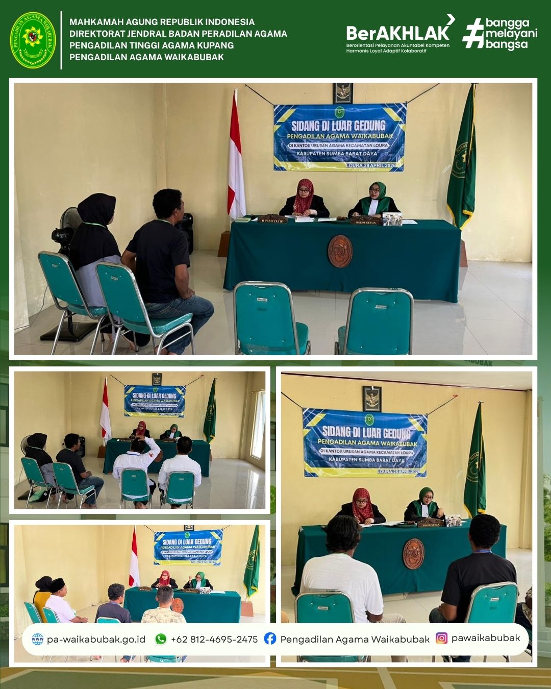 Waikabubak, 28 April 2026 – Dalam rangka mewujudkan asas peradilan yang sederhana, cepat, dan biaya ringan, Pengadilan Agama (PA) Waikabubak kembali melaksanakan kegiatan Sidang di Luar Gedung atau Sidang Keliling. Kali ini, tim persidangan PA Waikabubak melaksanakan pelayanan hukum bertempat di Gedung Kantor Urusan Agama (KUA) Kecamatan Loura.
